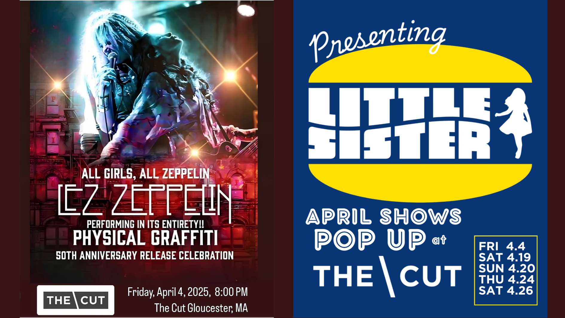 We’re Back Baby! Reopening night is this Friday April 4th with Lez Zeppelin performing Physical Graffiti in it’s entirety. Little Sister Burger Shoppe from Rockport will be providing good eats. Fast and casual QR code ordering right from your phone with a text when food is ready. Full bar still available plus all new arcade games , board games and pool. You don’t need tickets to the show to come and enjoy a fun night out! Tickets are still available but going fast.