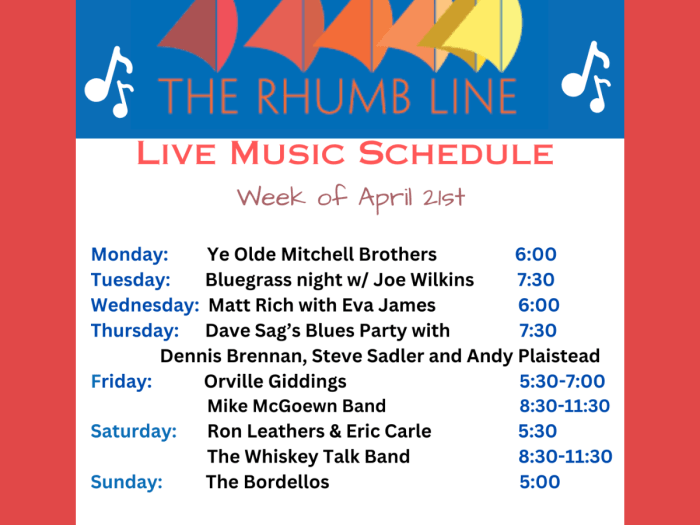 This week at the Rhumb Line. As always, music 7 days per week. Nine shows in all.