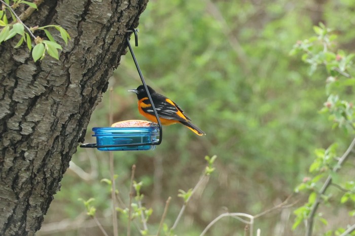 Welcome visitors to our backyard have returned and they seem very very hungry. We welcome back the hummingbirds and the Baltimore orioles. Such fun to watch. I haven’t seen any photos from Joey’s backyard so I’ll assume he hasn’t even filled his feeder yet.