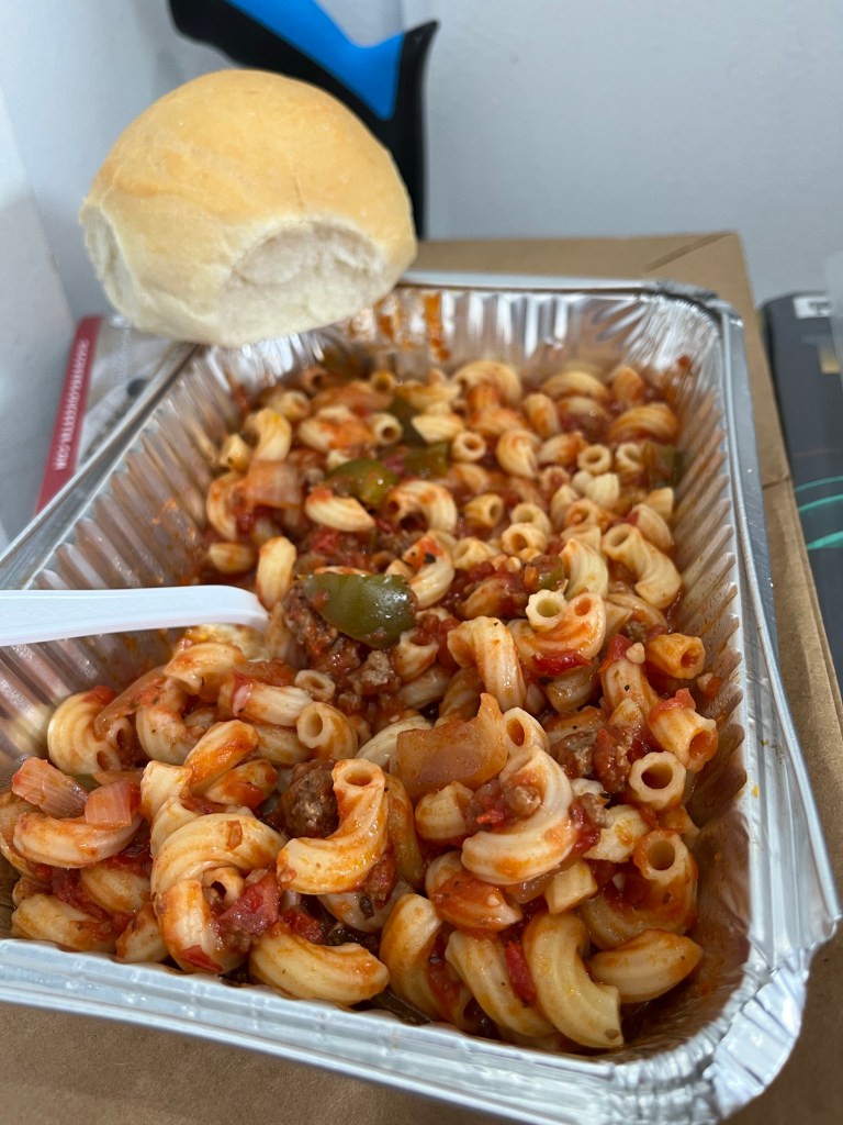 I don’t know about your school days, but we used to have to declare if we wanted to”hot lunch” or not each school day. I was reminded of those days on a recent cool and dreary day at the shop. So I went to Virgilio’s on Main St for a soothing hot lunch: American Chop Suey ( though we called it goulash in my house). PS and BTW, this was absolutely delicious and satisfying. There was enough left for another meal. Yes, I could make it myself….but…I don’t….(and Virgilio’s does)