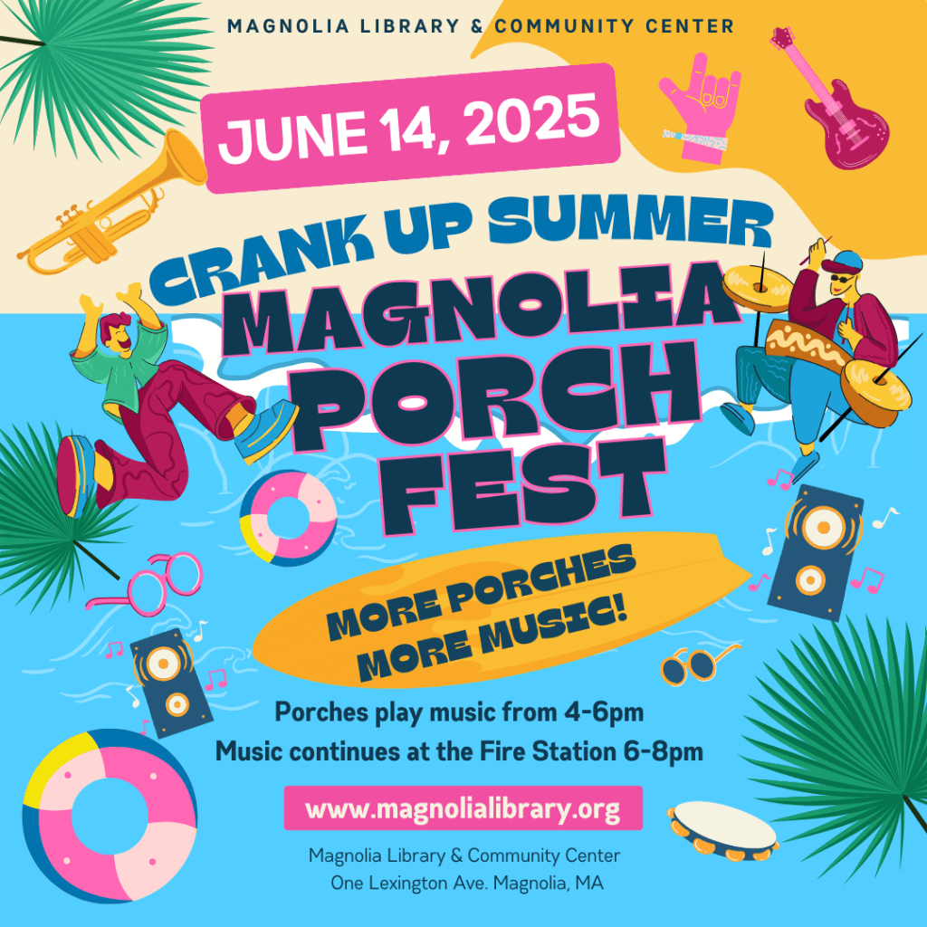Take a walk around beautiful Magnolia and enjoy music around every corner! This year there’s more porches, more music and more fun. Gloucester’s Lobster Roller, Meats & Sweets, and Holy Cow Ice Cream are all joining us along the way in addition to Magnolia’s 525 restaurant, Grillfriends, and JD Myers. Porches will be swingin’ from 4 to 6, and Funbucket will keep it going in the park by our fire station. until 8. Bring a beach chair or blanket to sit in the park, or dance by the ocean. It’s time to crank up your summer – starting at the Magnolia PorchFest!