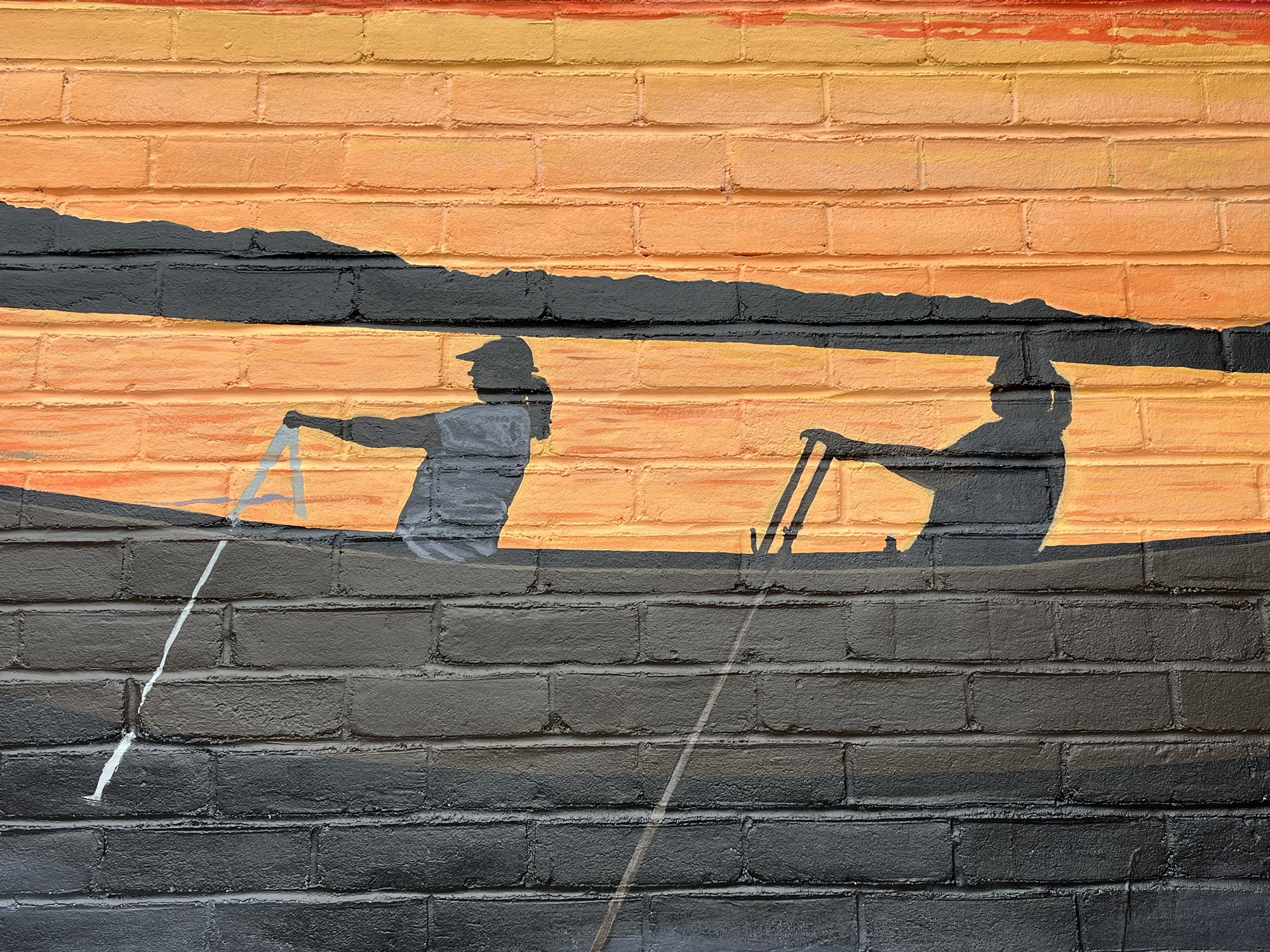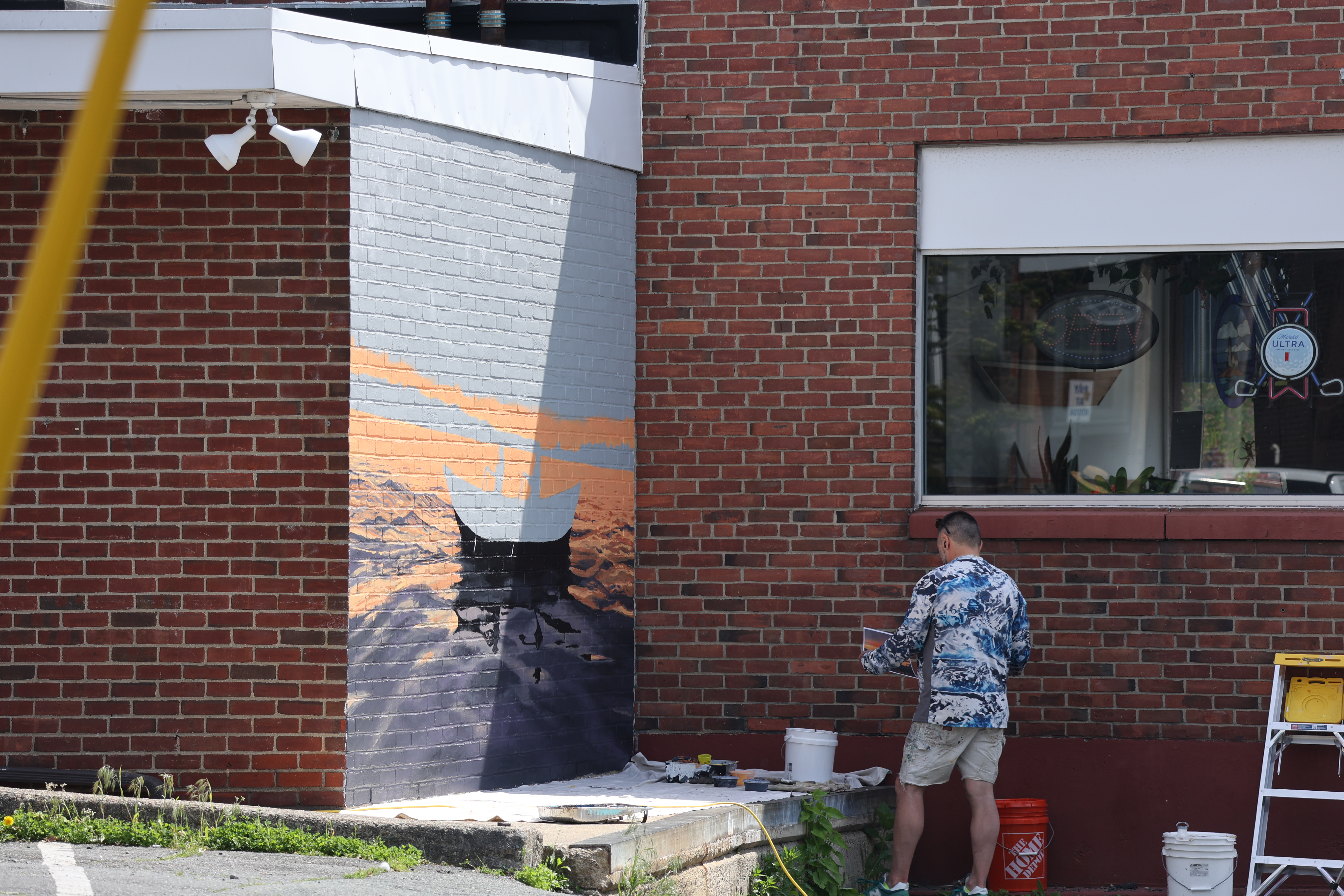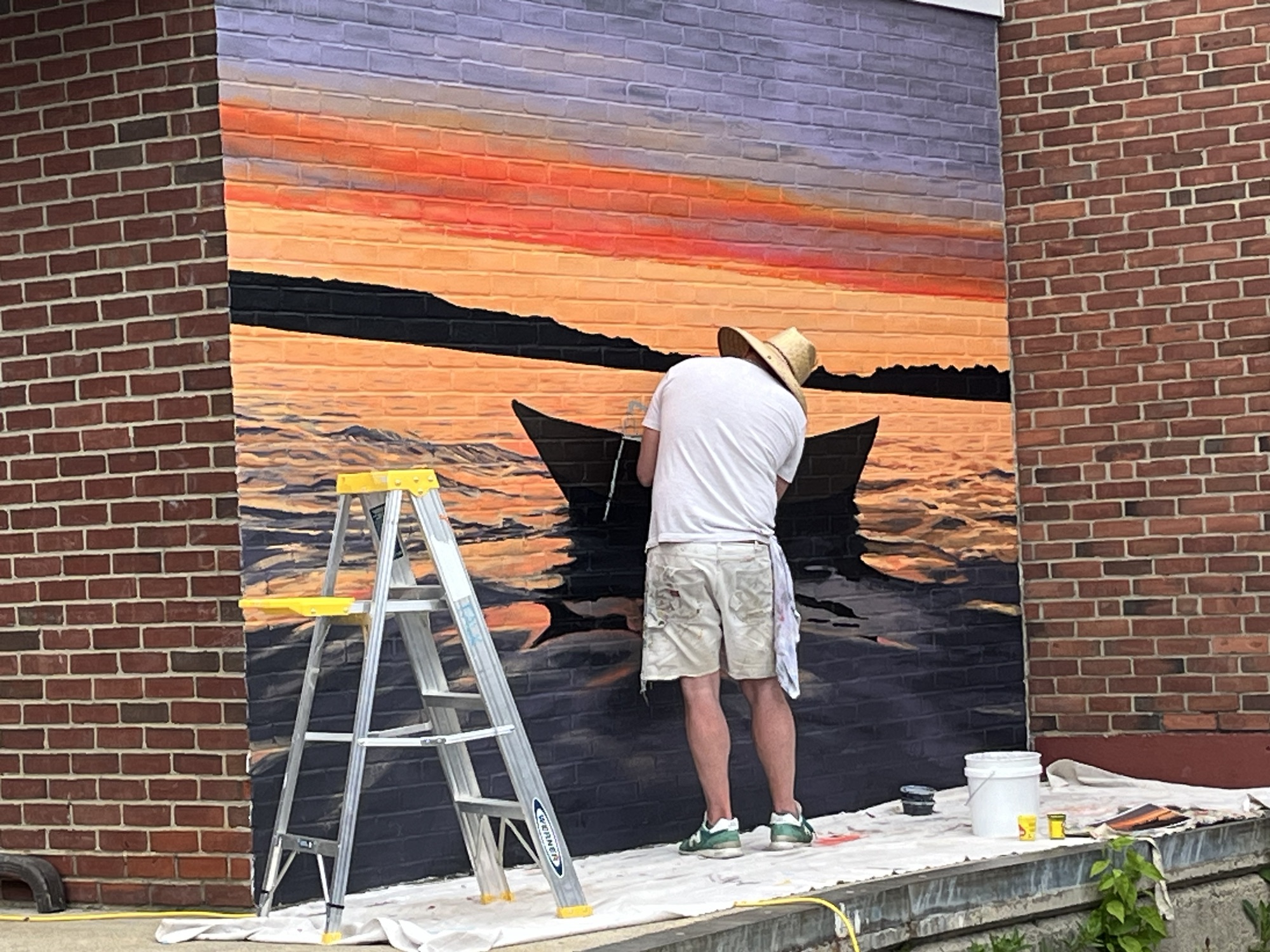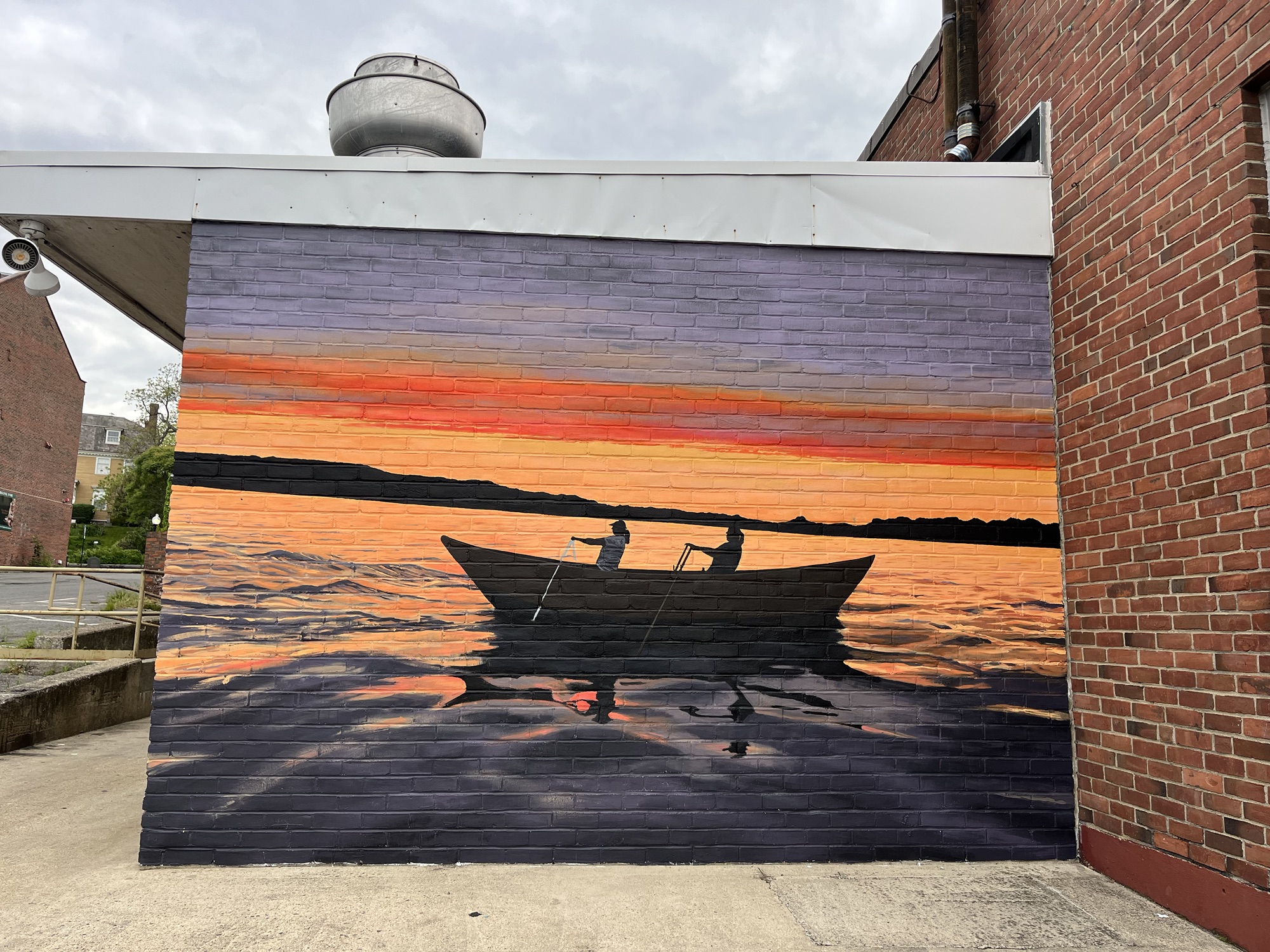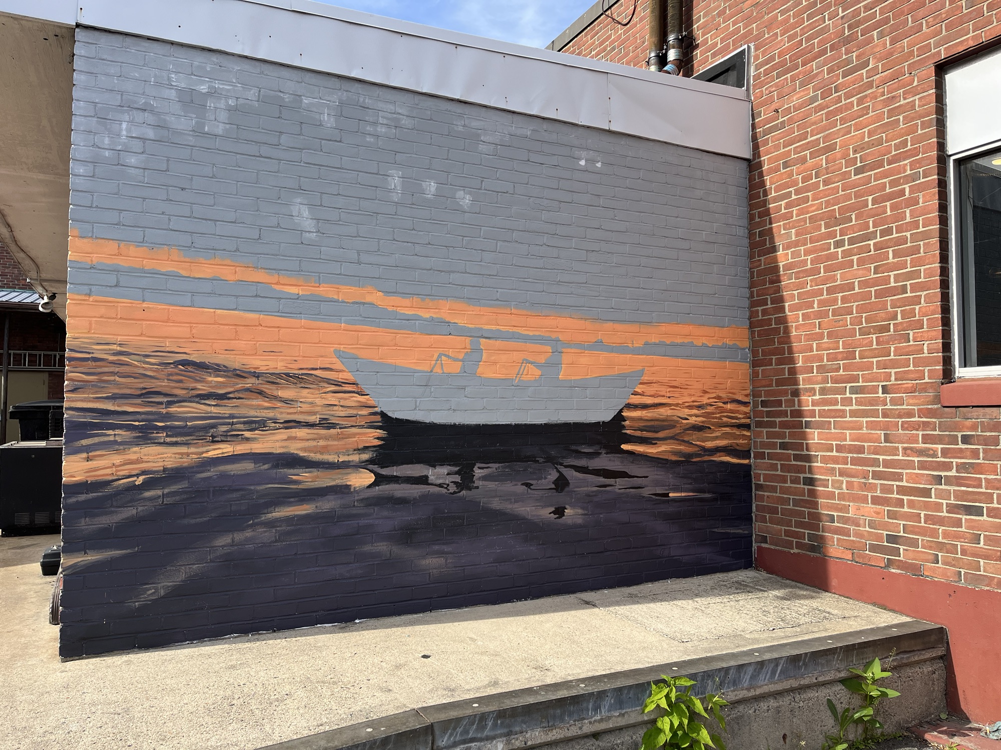 Thank you Awesome Gloucester and Josh Falk for the lovely Dory at Sunrise mural downtown on Rogers St at the Pilot House building. It’s fantastic! Here are some photos in progress and at completion. Thank you to my anonymous assistant for the extra info!