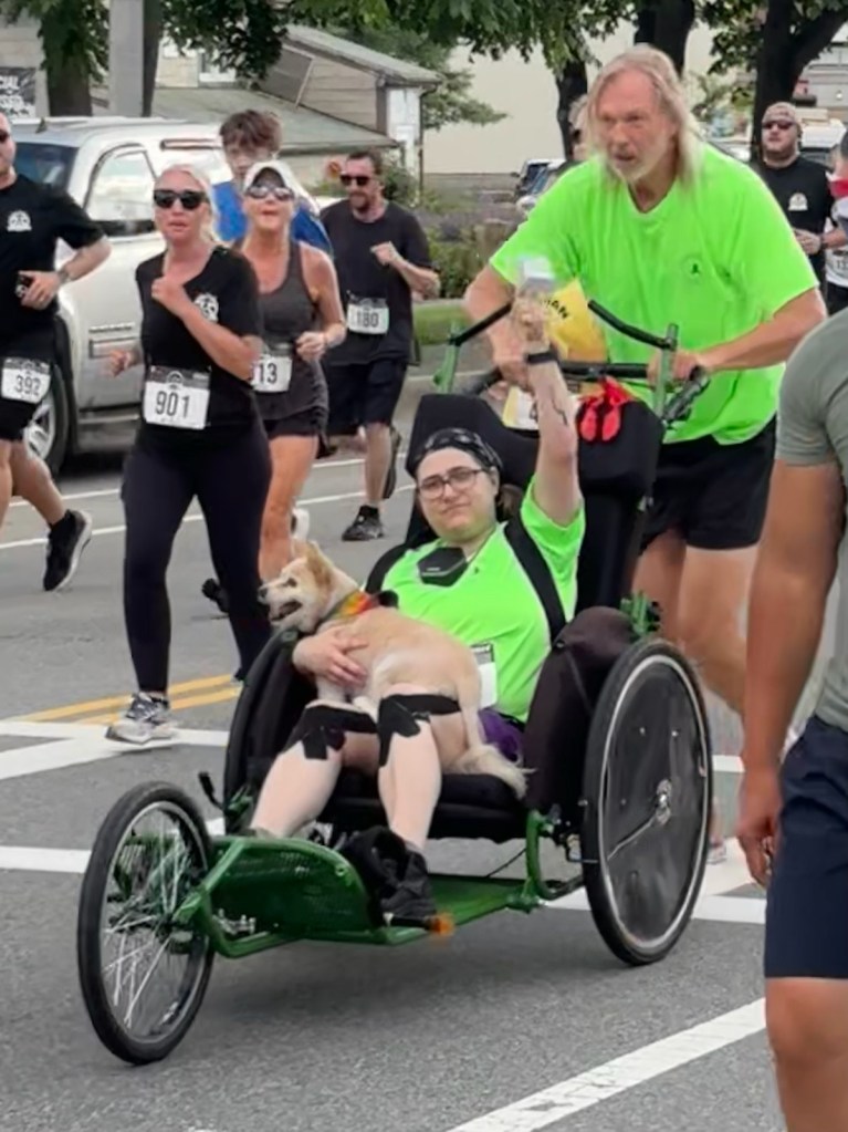 Believe it or not I am still searching for a rider to push in the mobility chair in the Fiesta 5k on the 26th of June here in Gloucester. I need to find someone this week to do a few test runs and get them comfortable in the chair. I am looking for a person with mobility issues, less than 150 lbs. (the lighter the better) who can possibly hold my dog Sunny for the race. They are in the chair for about an hour.