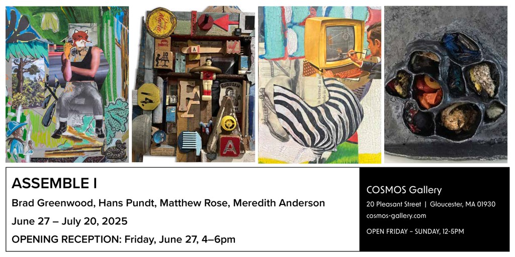 The first show, ASSEMBLE I, will open on Friday, June 27 and feature the works of four artists: Brad Greenwood (Los Angeles), Hans Pundt (Gloucester), Matthew Rose (Paris), and Meredith Anderson (Gloucester). Each artist brings a unique approach to the art form. Their aesthetics tend toward the surreal, humorous, beguiling, wry, strange, and erotic. COSMOS Gallery will exhibit a multitude of pieces from each artist, price range $3,000 – $100.