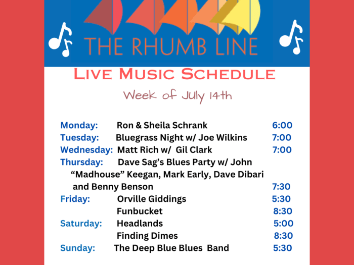 Here’s this week’s live music schedule at the Rhumb Line