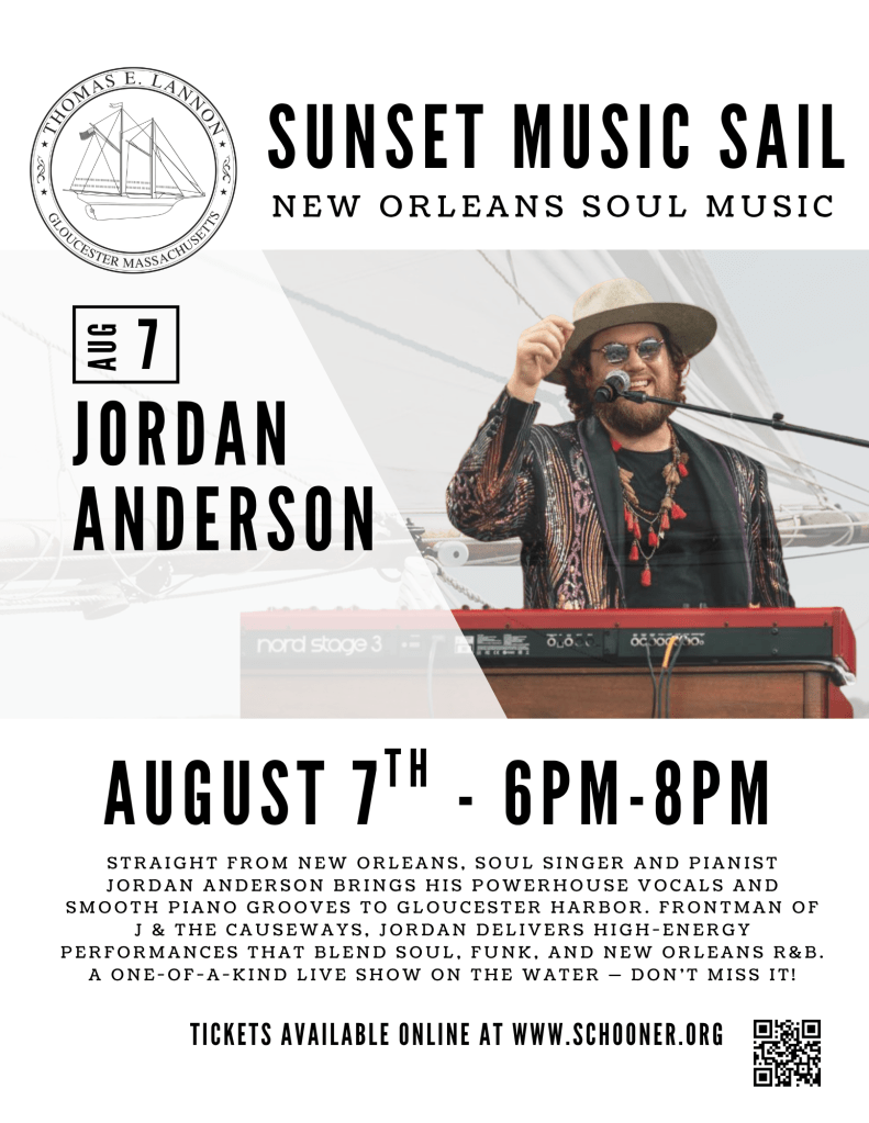 STRAIGHT FROM NEW ORLEANS, SOUL SINGER AND PIANIST JORDAN ANDERSON BRINGS HIS POWERHOUSE VOCALS AND SMOOTH PIANO GROOVES TO GLOUCESTER HARBOR. FRONTMAN OF J & THE CAUSEWAYS, JORDAN DELIVERS HIGH-ENERGY PERFORMANCES THAT BLEND SOUL, FUNK, AND NEW ORLEANS R&B. A ONE-OF-A-KIND LIVE SHOW ON THE WATER DON’T MISS IT!