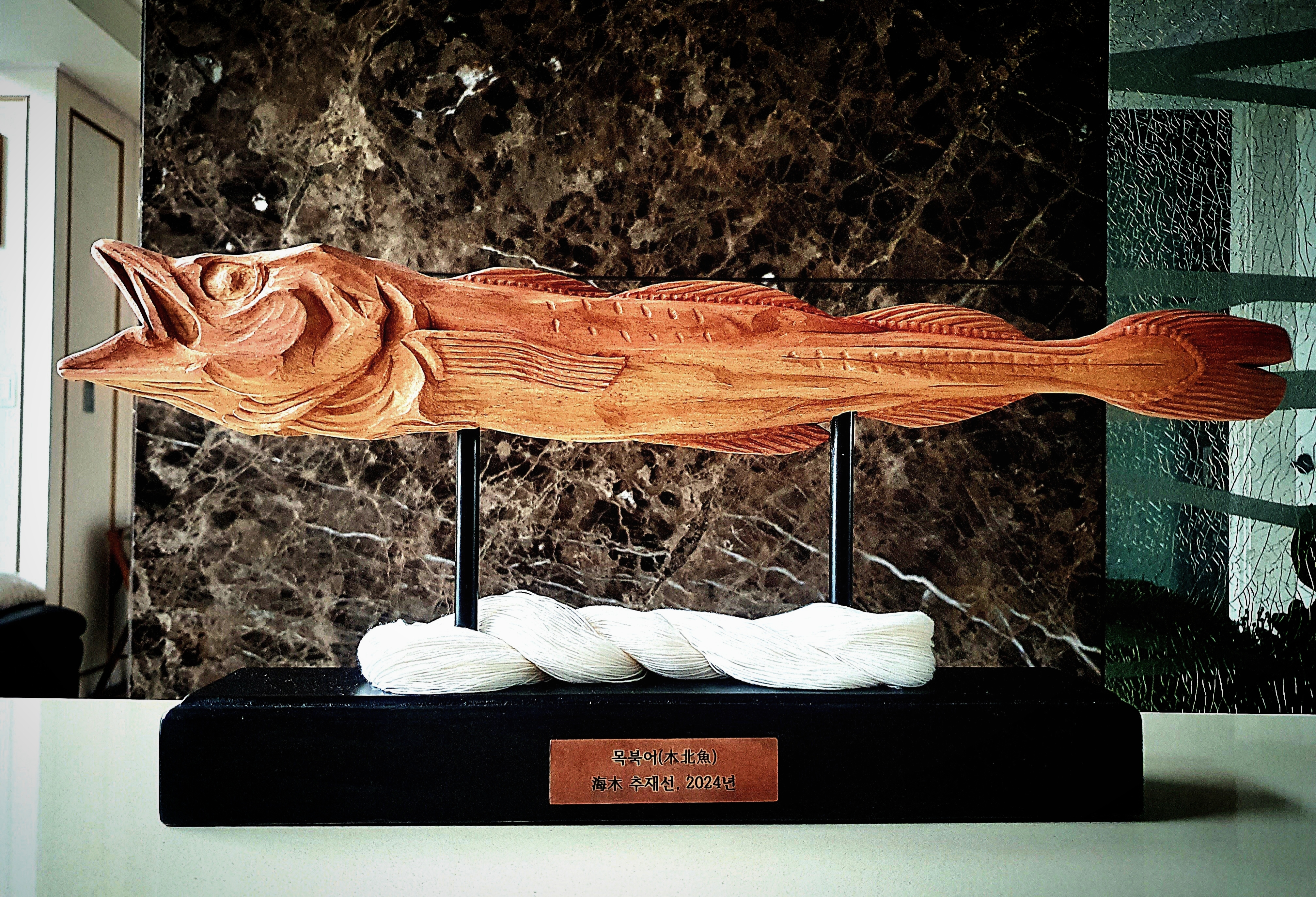 I’m sending you a photo of my special award piece. In Korea, there’s a folk belief that tying dried pollack with a string wards off misfortune and brings good luck. So, I carved dried pollack out of wood. I’m sending you a few more pieces of my work and some photos I took there 10 years ago.
