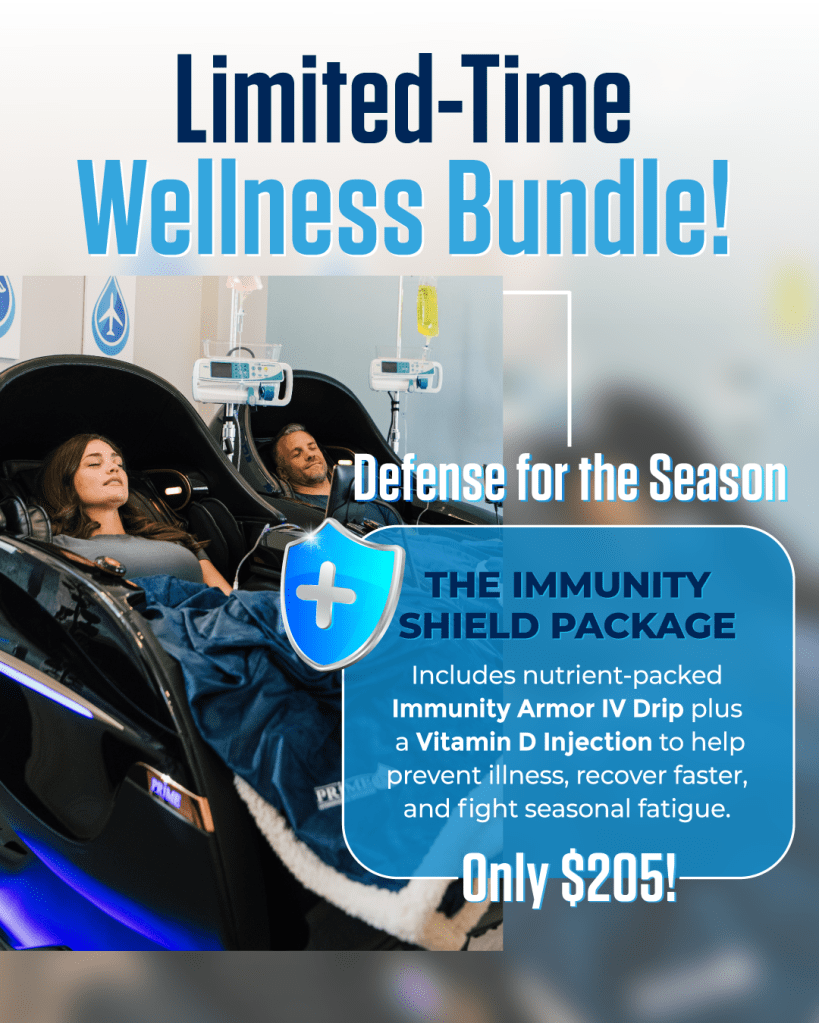 From back-to-school germs and packed calendars to holiday travel and cold & flu season, this time of year can take a toll on your immune system. The Immunity Shield Package combines our best-selling Immunity Armor IV Drip with a Vitamin D Injection to help prevent, shorten, and reduce the severity of seasonal illness so you can stay energized, focused, and well all season long! While your body gets what it needs, you’ll enjoy our 1 Hour Vacation experience — relaxing in our VIP lounge and zero-gravity massage chairs for total mind-and-body renewal.