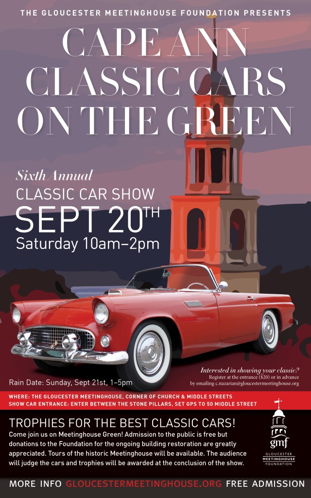 Please join us for the sixth annual Cape Ann Classic Cars on the Green on Saturday September 20th, from 10am to 2pm in front of the Gloucester Unitarian Universalist Church, GPS 50 Middle Street, Gloucester. The rain date for the event is on Sunday, September 21st from 1-5pm.