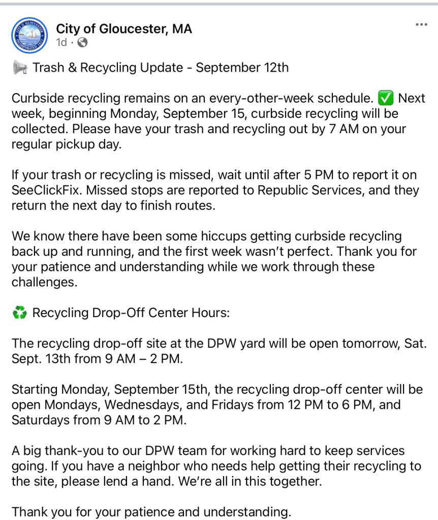 In case you are one of those residents wondering why you haven’t heard any trash/recycling updates, I urge you to sign up for the City of Gloucester Alert messaging system by clicking this link: https://bit.ly/Emergency-Alerting