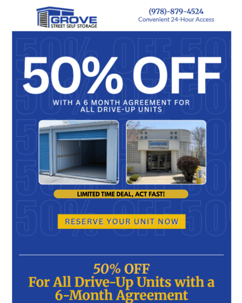All available outdoor storage units are 50% off with a 6-month agreement *cannot be combined with any other offer*