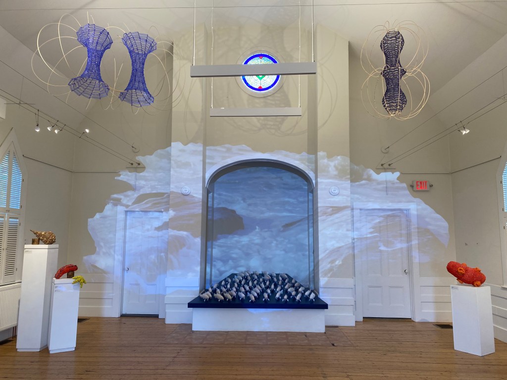 Incoming Ocean, a site-specific video installation by Georgie Friedman, splashes across the interior architecture of the Cultural Center. The waves, filmed at nearby Halibut Point State Park, break over walls and doors, advancing toward one’s feet while also washing across a school of 50 life-sized Ghost Cod, hand-carved by Jessica Straus. Meanwhile a soundscape of whale songs and ocean sounds, Sky Fathoms Water by Perri Lynch Howard, arrives softly, builds momentum, and ebbs quietly. The visitor is fully immersed in sight and sound.