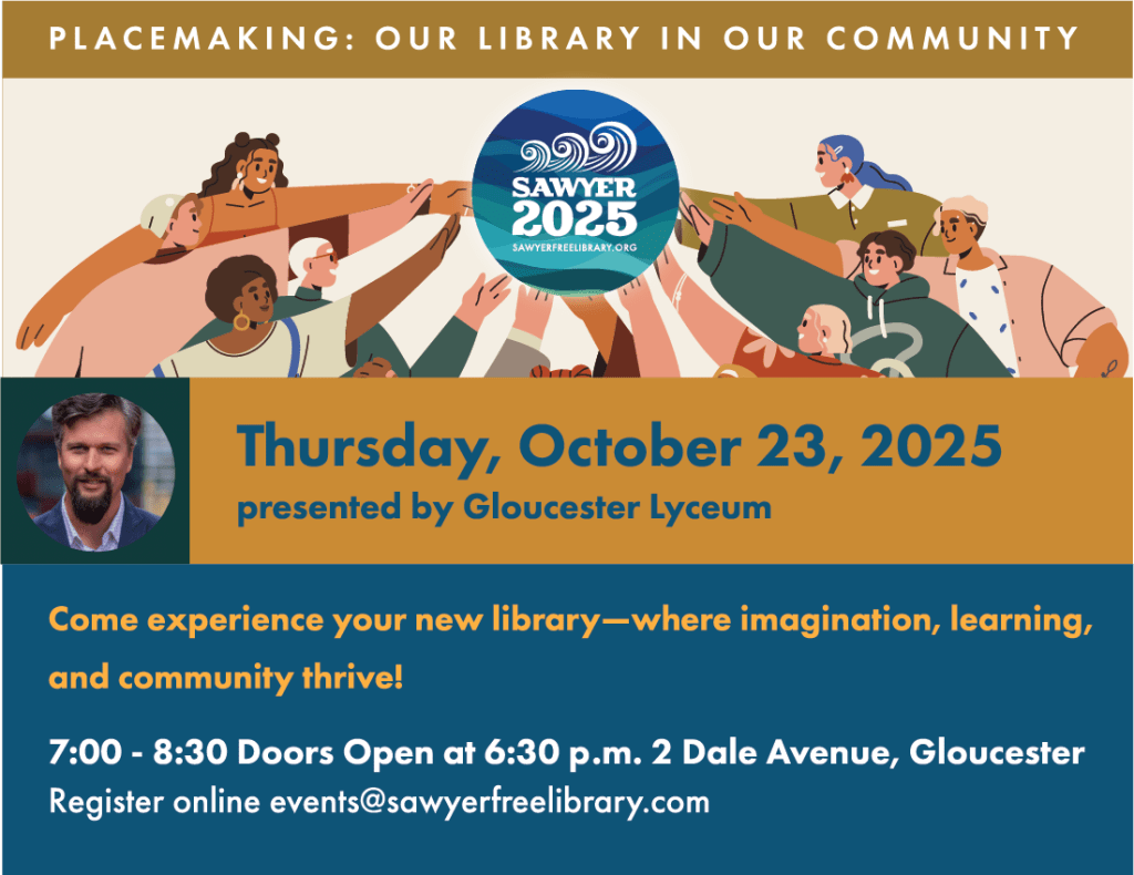The Sawyer Free Library will officially relaunch the Gloucester Lyceum with a special event, Placemaking: Our Library In Our Community, featuring internationally renowned placemaking leader Ethan Kent, Executive Director of PlacemakingX.
