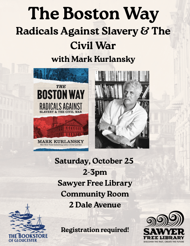 Join the Sawyer Free Library for an afternoon with acclaimed author Mark Kurlansky as he discusses his latest book, The Boston Way: Radicals Against Slavery & The Civil War on Saturday, October 25 from 2:00 to 3:00 PM.