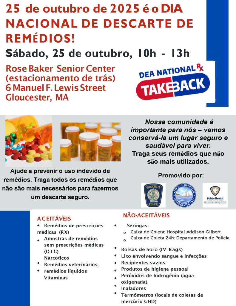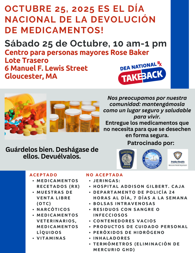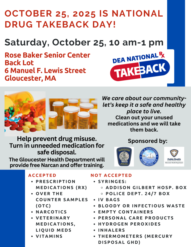 National Drug Takeback Day event is taking place next Saturday, October 25th from 10 am to 1 pm at the Rose Baker Senior Center in the Back Lot.
