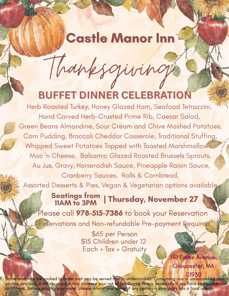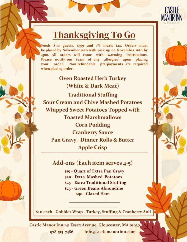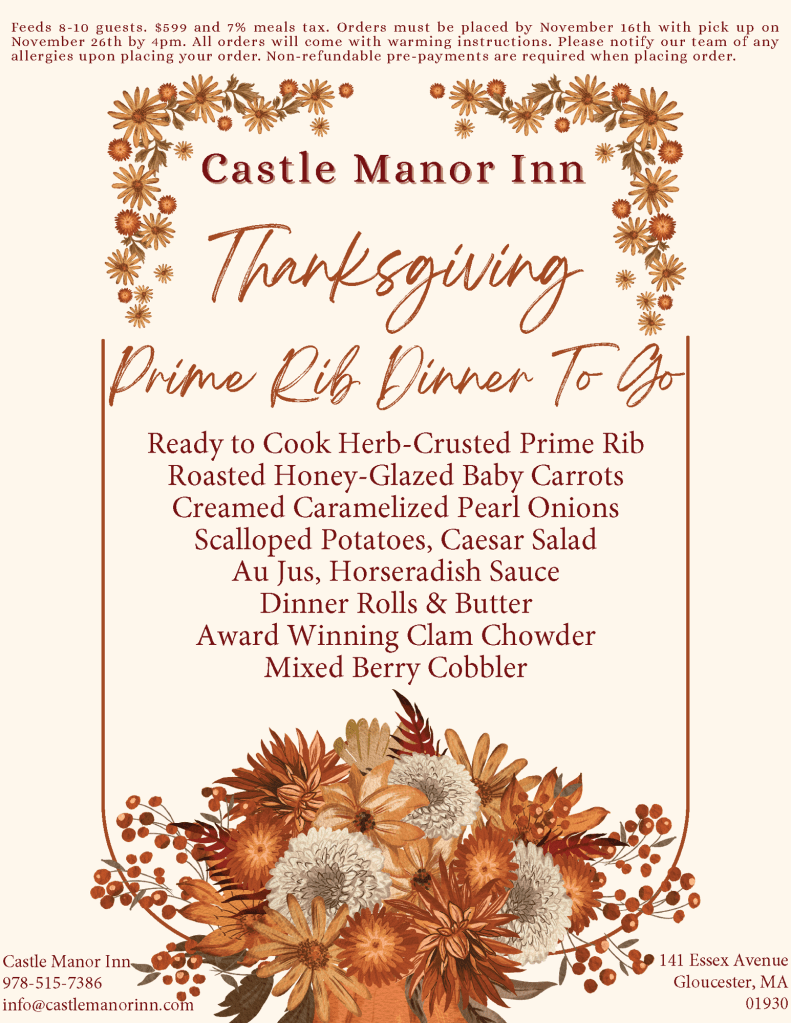 Let us do the heavy lifting this year so you can relax and enjoy your Thanksgiving Dinner time with your family and friends either here or at home. You have more choices with Castle Manor Inn to have your Thanksgiving Dinner the way you want it.