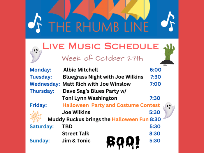 This week at The Rhumb Line! And….don’t miss the Halloween Fun on Friday! An early show with Joe Wilkins and then Muddy Ruckus bring the Halloween ruckus with a costume party and contest!