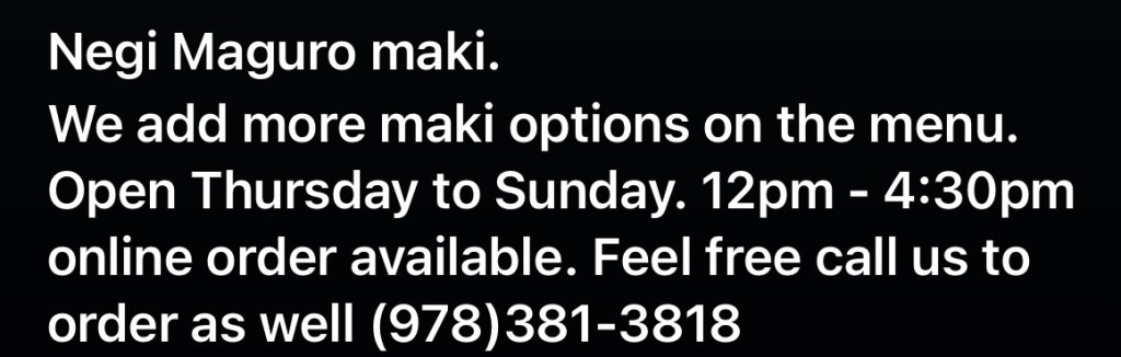 Open Thursday to Sunday. 12pm – 4:30pm online order available. Feel free call us to order as well (978)381-3818