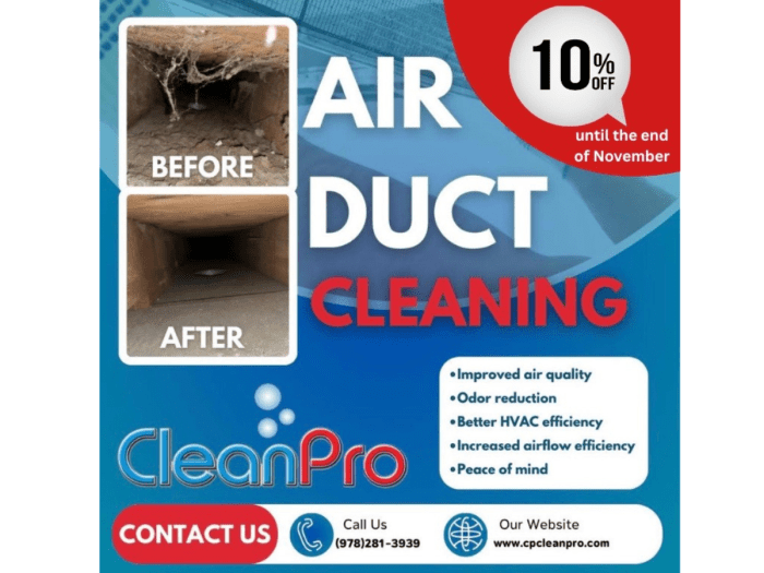 Call CleanPro to take advantage of this 10% air duct cleaning. It’s not only time to set the clocks back, it’s time to clean those air ducts. So many benefits including improved air quality, odor reduction, better HVAC efficiency, increased airflow efficiency, and Peace of Mind! https://www.cpcleanpro.com/