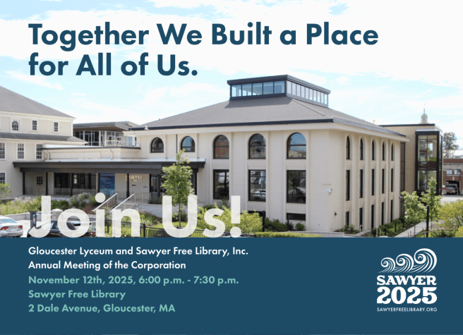 REMINDER – Please join us for our Annual Meeting in the new Community Room of the reimagined Sawyer Free Library. The evening will feature remarks from Board President Mern Sibley, Mayor Greg Verga, and MBLC Commissioner Joyce Linehan, who will speak on standing up for libraries and intellectual freedom. Library Director Jenny Benedict will share highlights from this milestone year and a look ahead to the Library’s next chapter. Refreshments will be served.