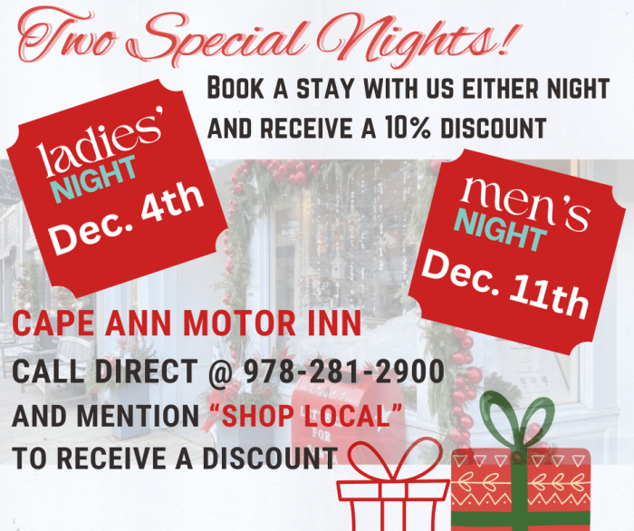 Enjoy a night at Cape Ann Motor Inn on December 4th or 11th to celebrate Ladies’ Night and/or Men’s Night Holiday Shopping downtown and get 10% off! Two of our favorite holiday nights in town are Ladies’ Night and Men’s Night. The downtown area is hopping with music and merriment, shopping, holiday strollers, and all sorts of fun! If you book a night at Cape Ann Motor Inn on either December 4th or December 11th you will receive a 10% discount off your stay. Just call directly at 978-281-2900 and mention “Shop Local” to receive your discount and then make a night of it!
