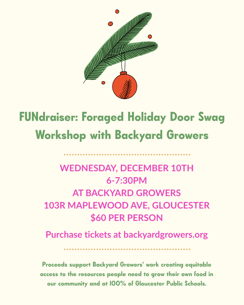 Join Backyard Growers for an evening of festive fun for a cause at our FUNdraiser: Holiday Door Swag Workshop! Learn to make your own holiday swag for your door using seasonal foraged materials found on Cape Ann. We’ll provide drinks, nibbles, and all the materials.