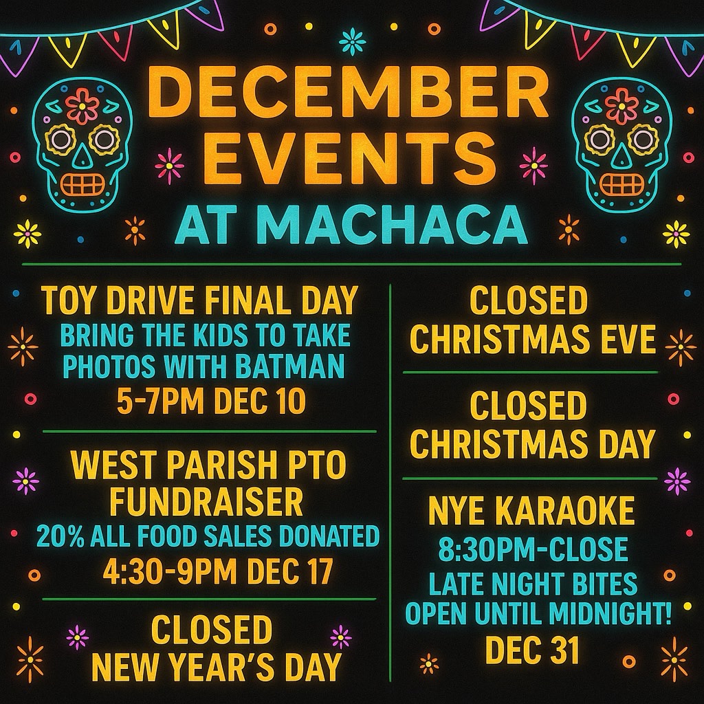 The holidays are officially here, and Machaca is PACKED with fun, food, and festive community events all month long. Whether you’re stopping in for a family moment, supporting a great cause, or ready to ring in the New Year Machaca-style… December is the month to be at 14 Rogers Street.