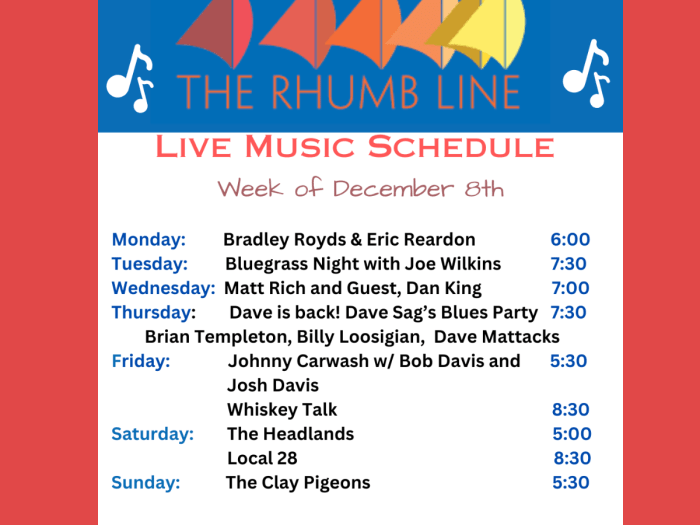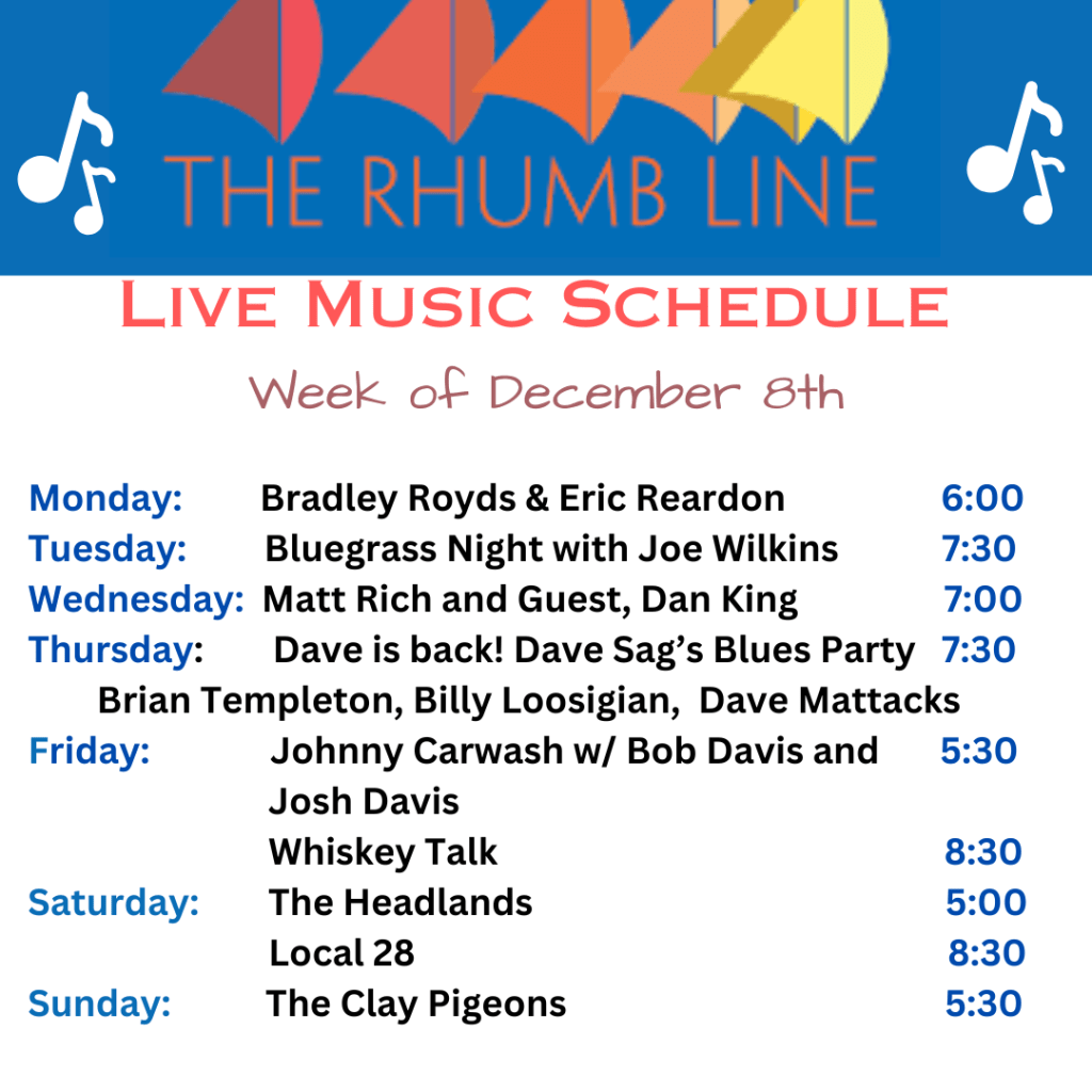 Here’s this week’s music line up at The Rhumb Line. As always, live music seven days per week.