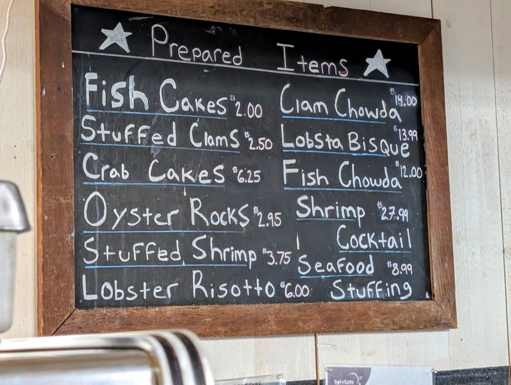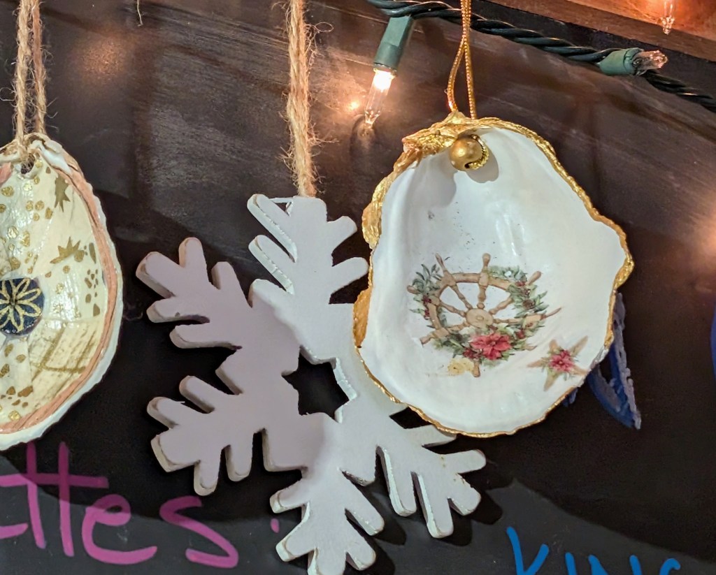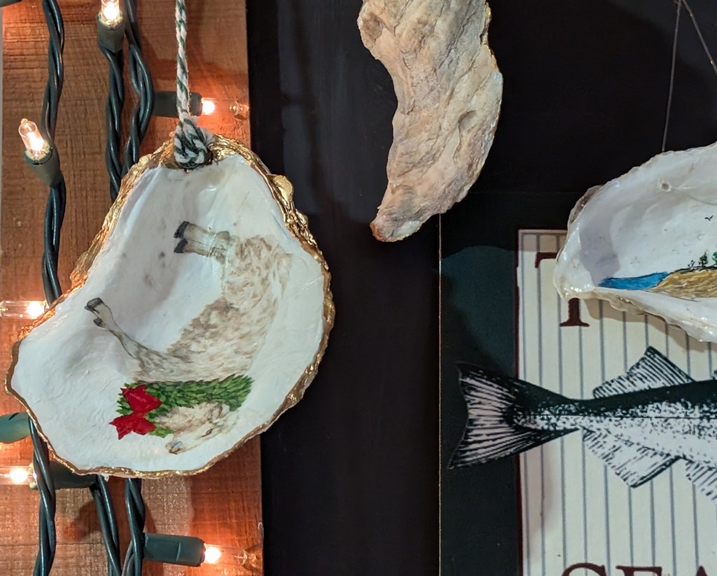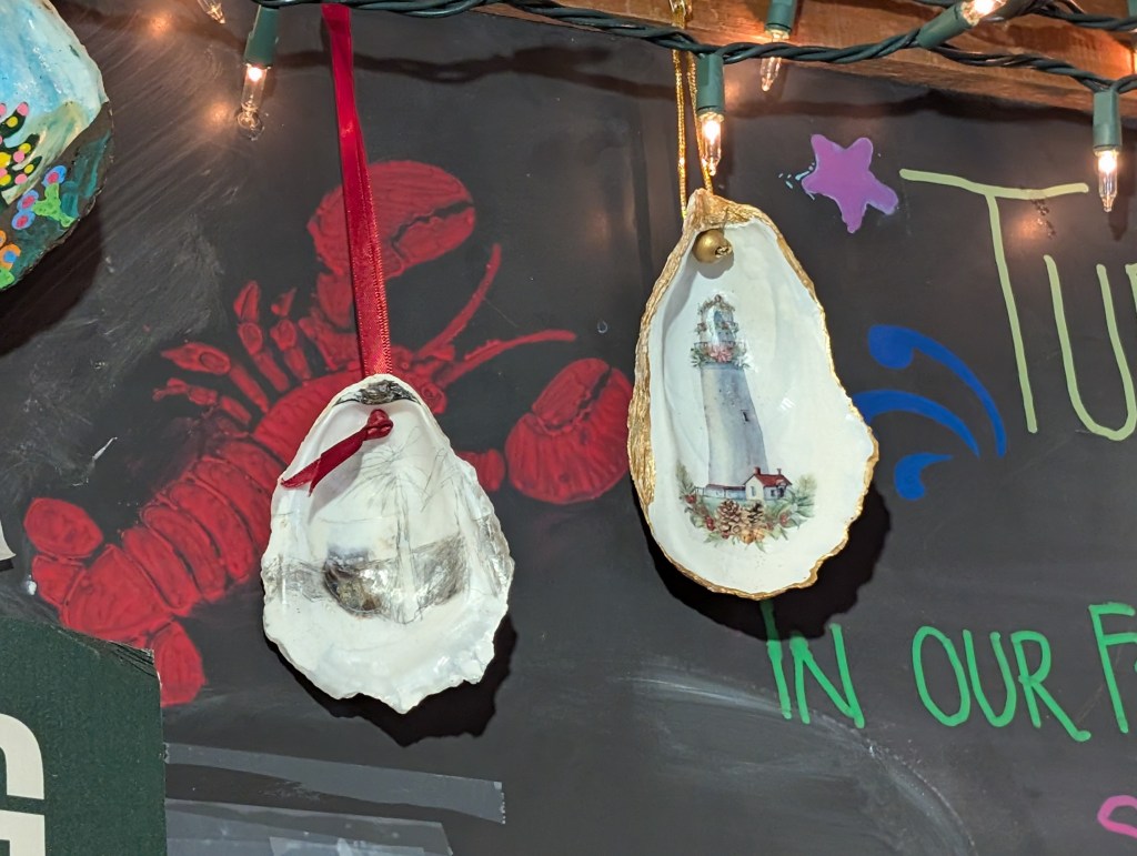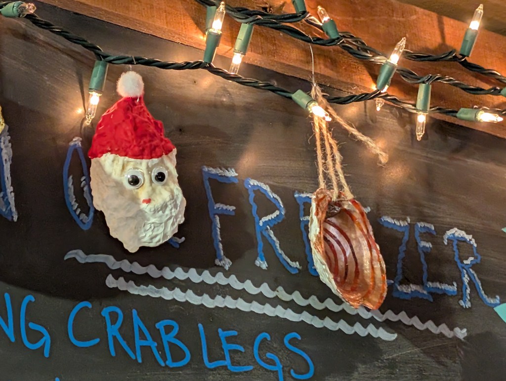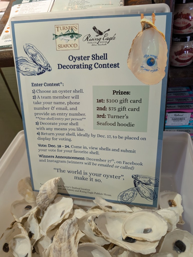 ‘Tis the season while you’re waiting for your order and happily browsing the prepared case, shelves, and refrigerators, there’s more eye candy. Share the news that Turner’s Seafood Oyster Shell Decorating Contest 2025 is LIVE. check out the contenders in the fish net and the garland festooned with prior year entries.