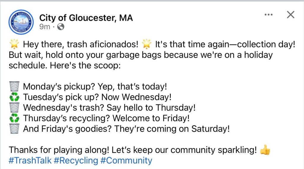 See? I knew you would forget that the City is on a holiday pickup schedule this week. I’m seeing several Facebook posts with questions that have been addressed on the City of Gloucester Facebook page. Maybe check there first if there’s something storm related you are wondering about especially related to parking bans or trash pickup schedule. The City is pretty good at posting relevant info to Facebook and online.