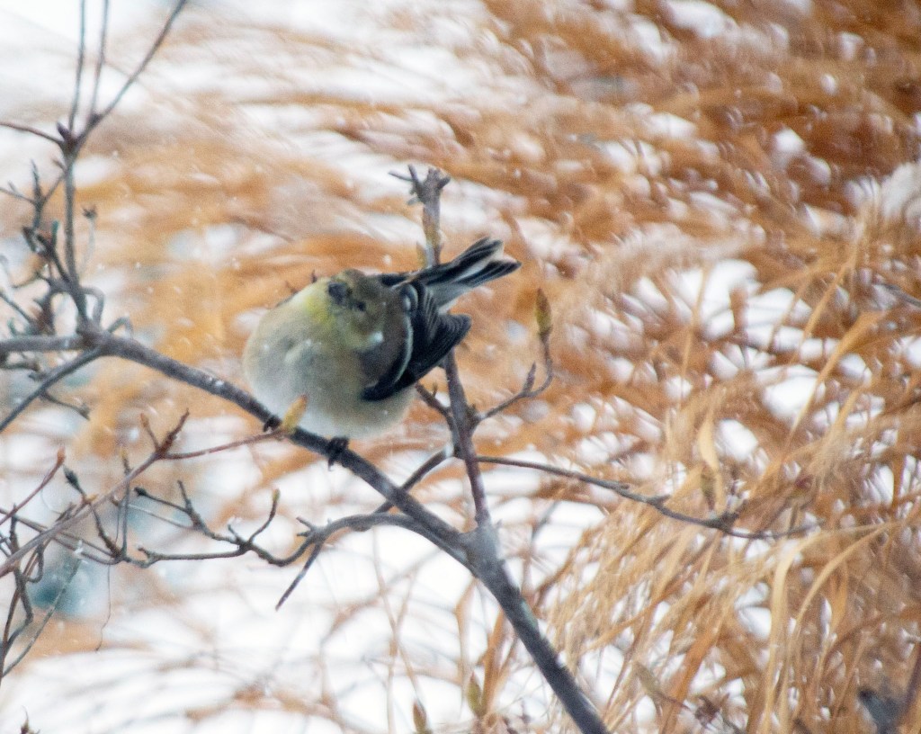 Goldfinch ready for takeoff on a snowy day