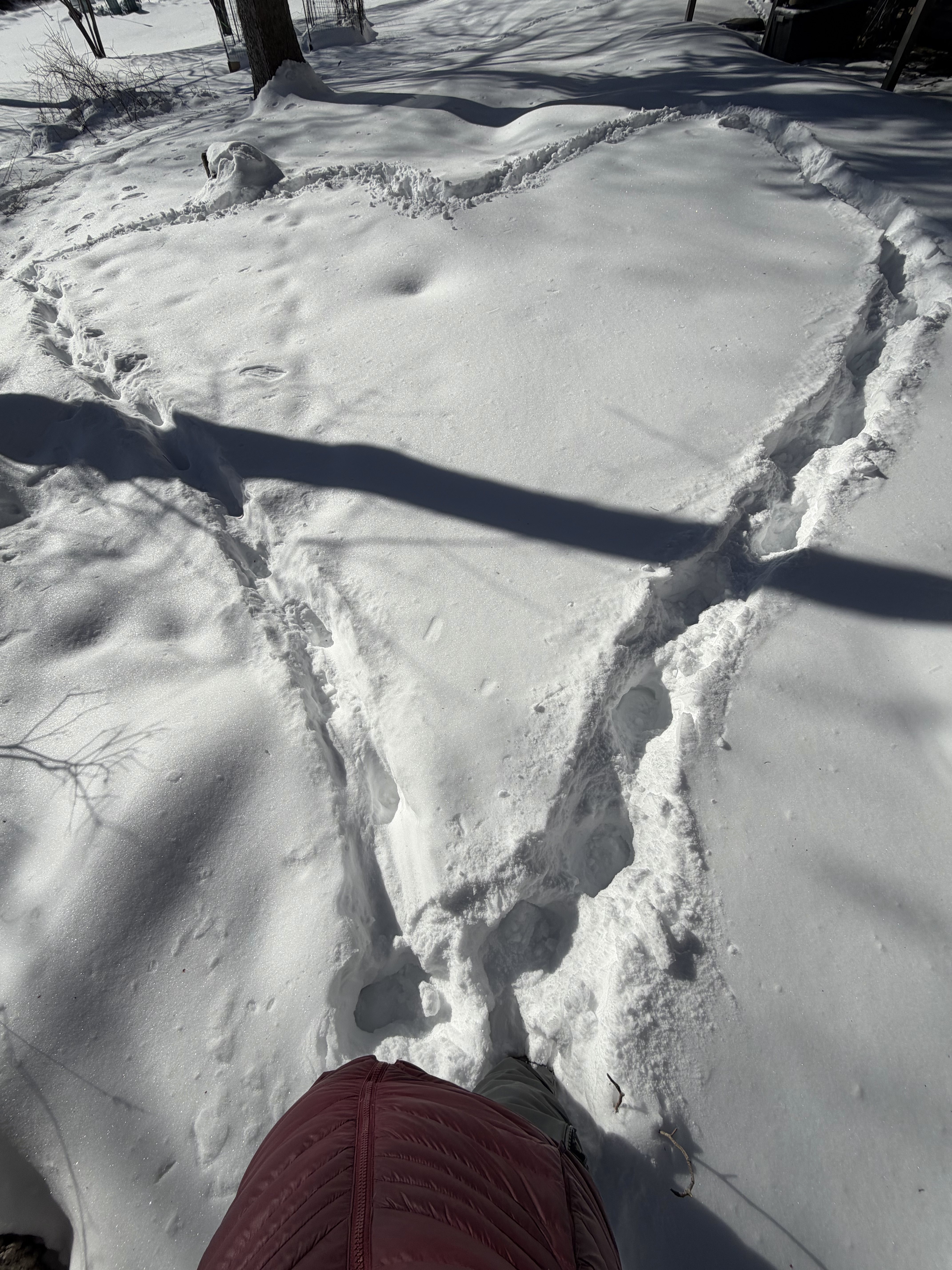 I have made a tradition of going out into the snow and stomping out a Valentine’s Day heart for GMG Jim each year. This year, the extra snowfall made a special playground for the wildlife in our back yard, so I used the paths created to form this year’s heart. It delights me to think the animals helped with this year’s heart. But I had to chuckle when I came across one spot in which poop was left behind. So GMG Jim’s Valentine’s Day heart also includes a very specially deposited greeting from the wildlife. Happy Valentine’s Day to all!
