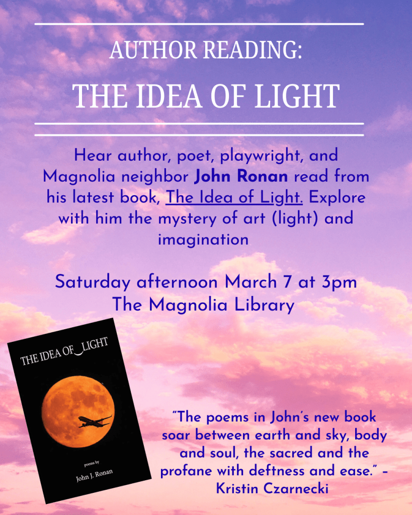 March 7 at 3pm, John will share his latest book, The Idea of Light at the Magnolia Library, 1 Lexington Ave in lMagnolia. Join us as he explores the relation between art and imagination.