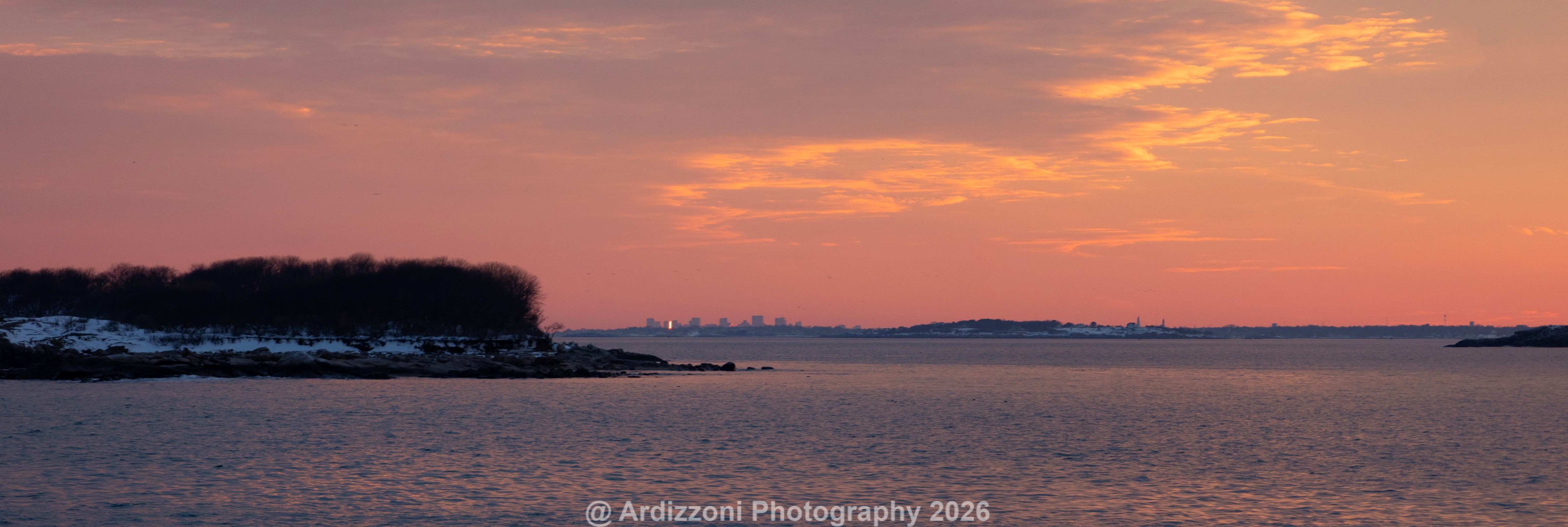 The sun setting had sun pillars, multiply colors, blue ocean and the city of Boston was visible.