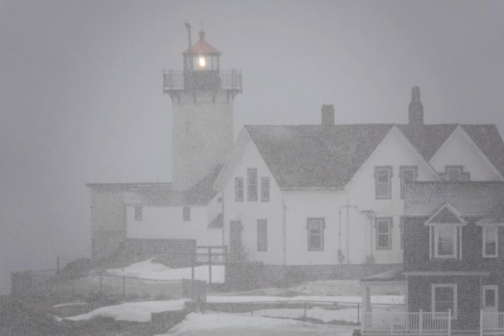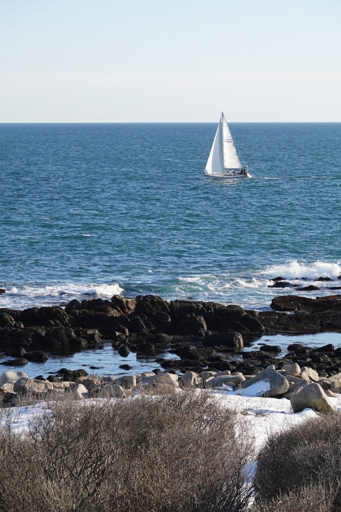Exactly a month ago, an early sail outside the harbor. Snow still on the rocks.