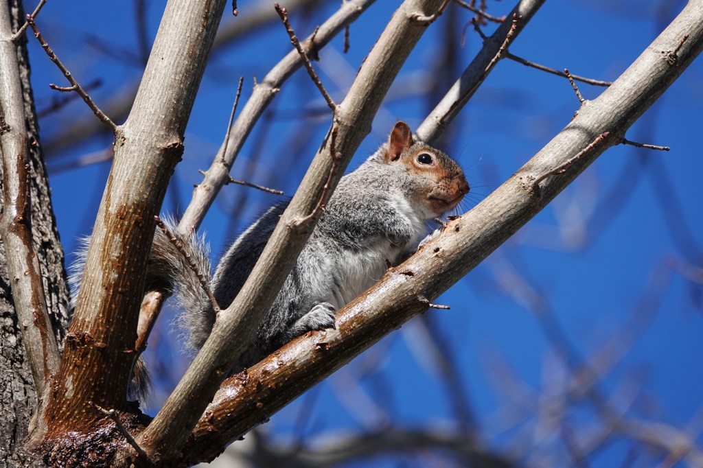 Squirrels traveled the tree branch network, waiting for more snow on the ground to melt.