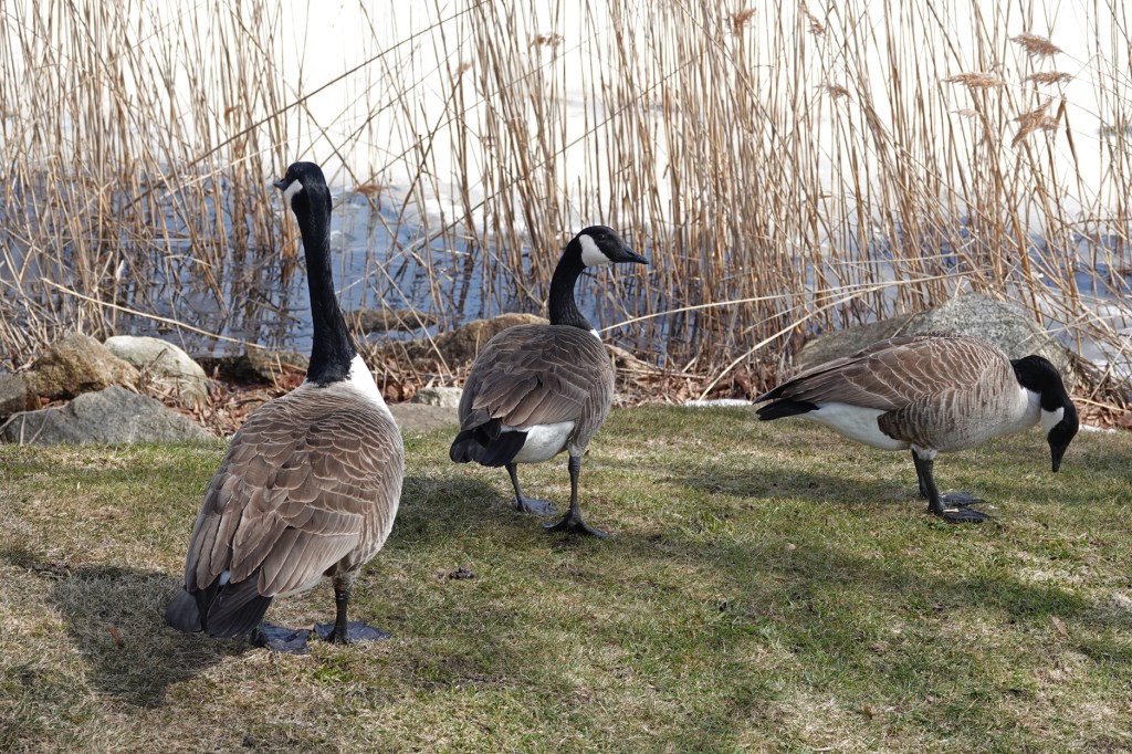Canada Geese eyeing a narrow strip of blue water between ice and shore on Niles Pond.
