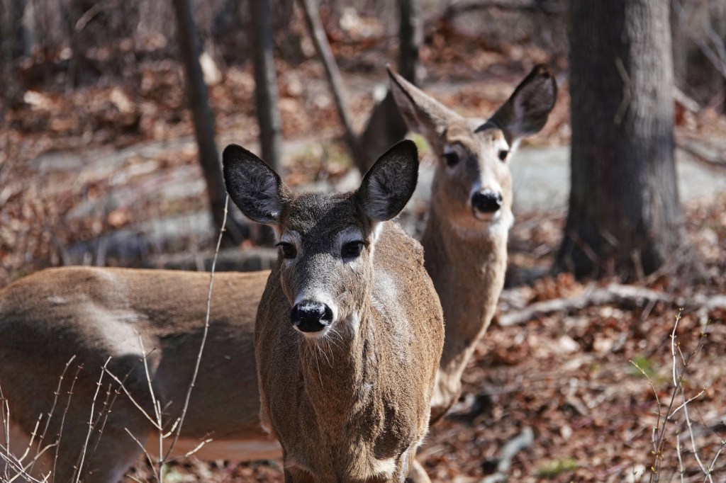 Foraging for food is easier without snow, for the White-tailed Deer. And they’re not afraid.