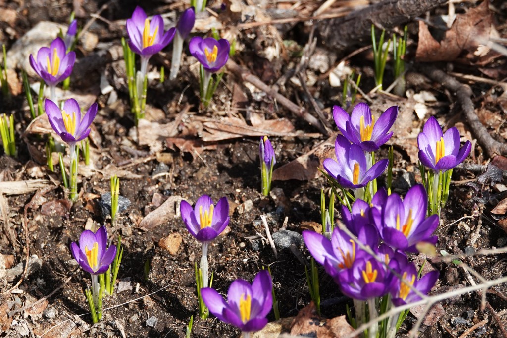 Newly-blooming crocuses. They were snipped off by the deer before the next morning.