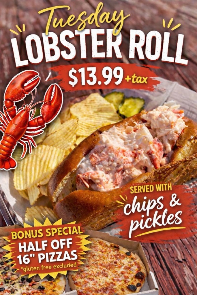 Surfside Pizza and Subs Tuesday 4/14 ๐Ÿฆž๐Ÿ•๐Ÿฆž$13.99+tax Lobster Roll๐Ÿ•Half Off 16โ€ Pizzas *Gluten Free Excluded