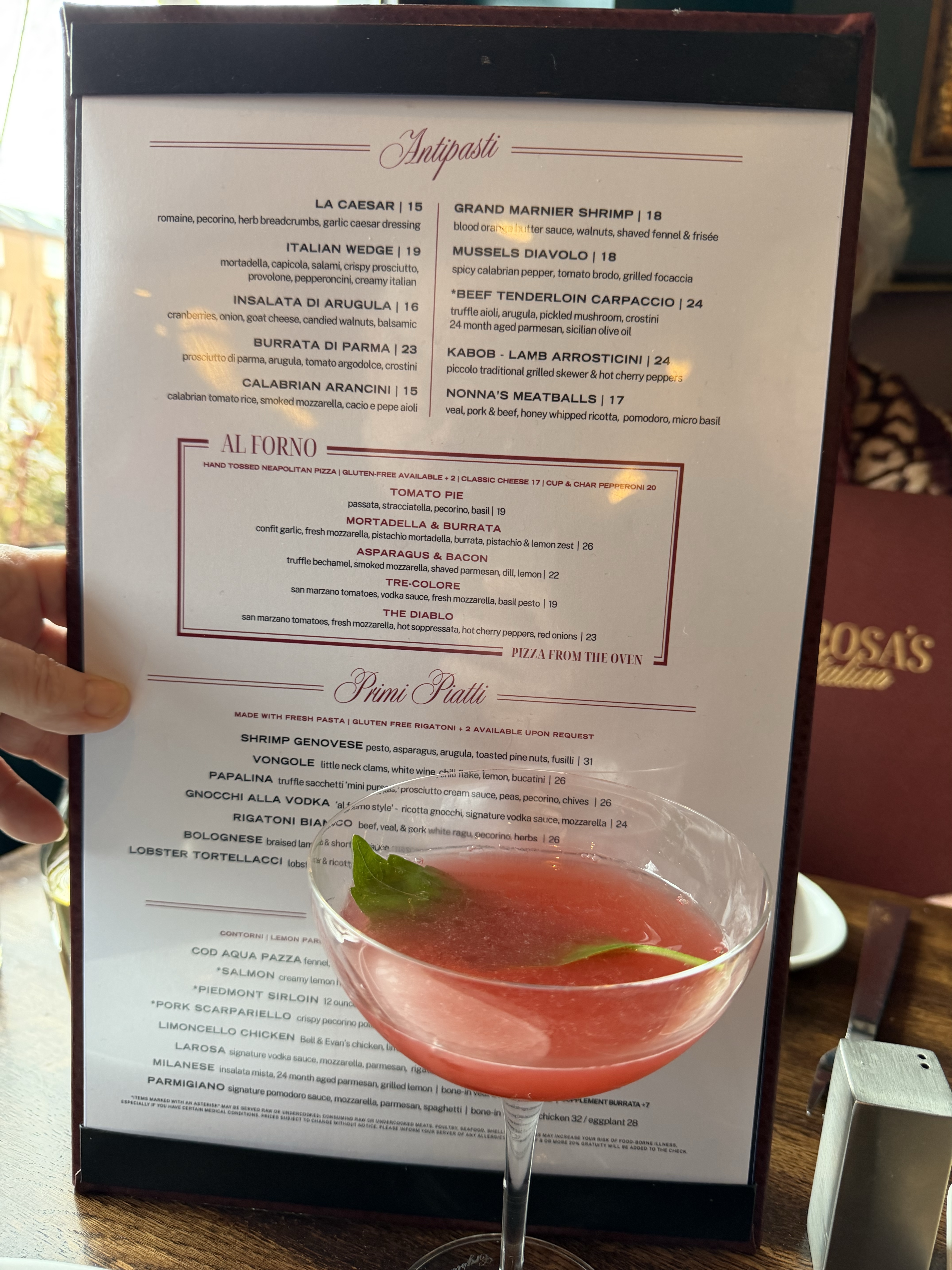 Here you see some of our food selections including Caesar salad, meatballs, prosciutto plate, Rigatoni Blanco, Chicken Milanese, and a Salmon entree. Our LaRosa friends were quite pleased with our entire adventure. It was WELL worth the drive. Highly recommended for a special occasion gathering of friends or family. Here’s a link for more info.