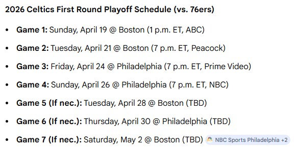 The Boston Celtics will face the Philadelphia 76ers in the first round of the 2026 NBA Playoffs, starting April 19, 2026, with home-court advantage.