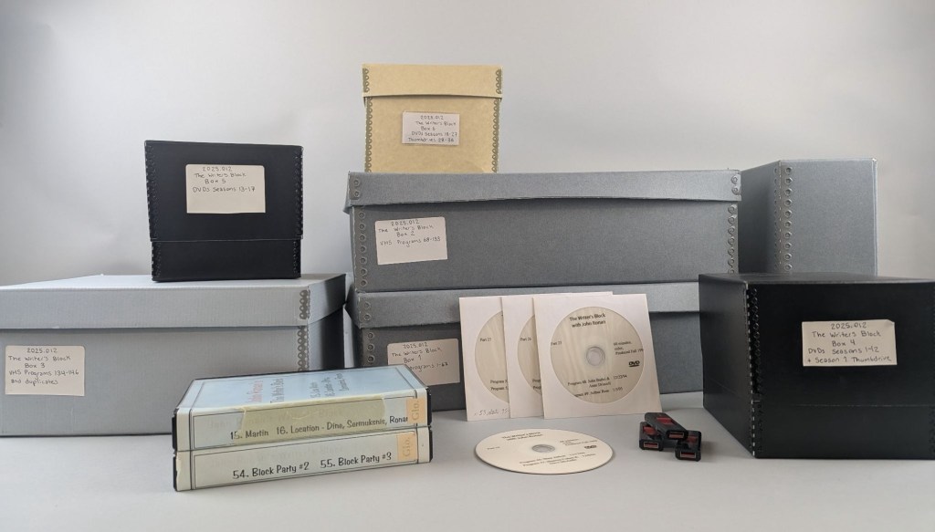 In 2025, John Ronan, producer and host of The Writer’s Block, gifted the program’s archives to the Cape Ann Museum. This significant donation ensures the preservation and public accessibility of the series, furthering and advancing the Museum’s commitment to collecting and sharing stories of contemporary Cape Ann.