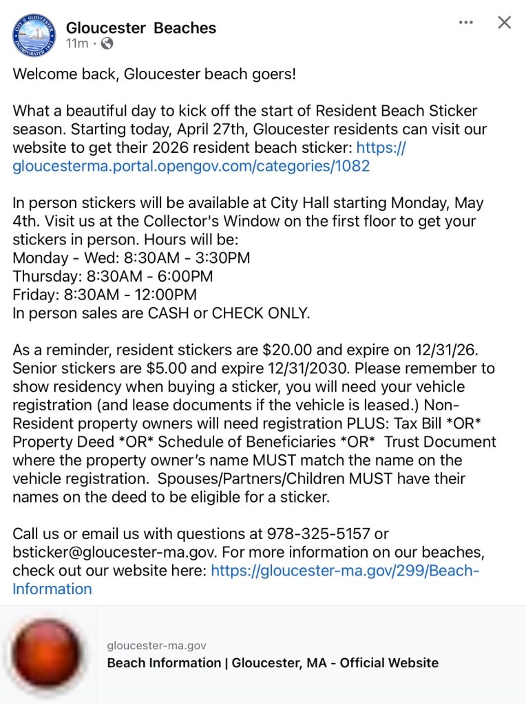 Sharing information from Gloucester Beaches Facebook page. This screenshot does not contain live link so here you go: https://gloucesterma.portal.opengov.com/categories/1082 OR for more info try https://gloucester-ma.gov/299/Beach-Information