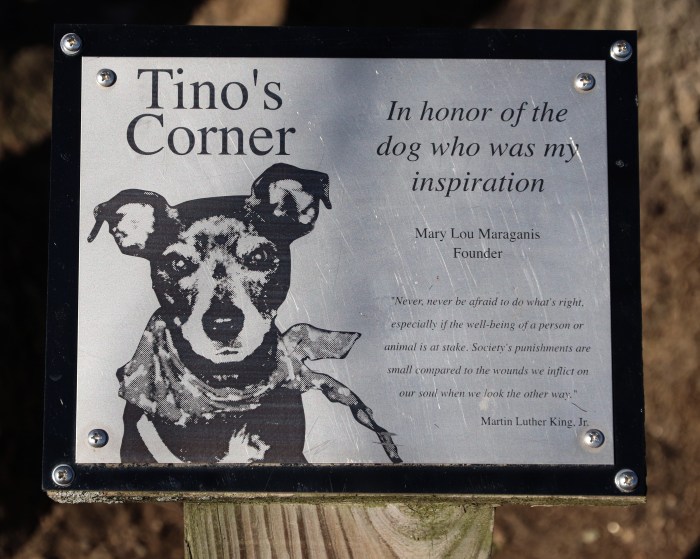 Mary Lou Marganis, founder of the Gloucester Dog Park shares the Tino’s Corner plaque with us.Ā The plaque illuminates one of the founding principles of the dog park. Tino’s Corner is a special area of the dog park forĀ dogs not ready for the park, dogs that need special training, or dogs that need time to adjust.