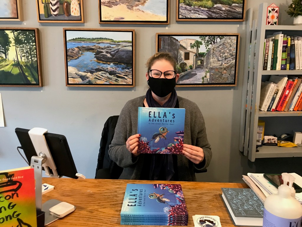 The Bookstore of Gloucester will be carrying copies of Ella’s Adventures in the Great Barrier Reef. Pictured here is owner Arwen Severance with the book. Proceeds from the sales of Ella’s Adventures supports Ocean Alliance’s research expeditions.
