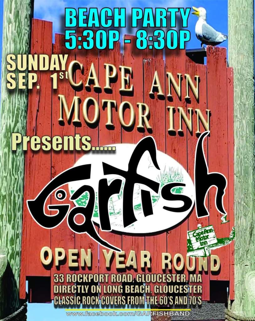 This is a free show and everyone is invited. GARFISH hits the stage from 5:30-8:30pm. This End of the Summer Concert continues thanks to the Residents of Long Beach and the Cape Ann Motor Inn.