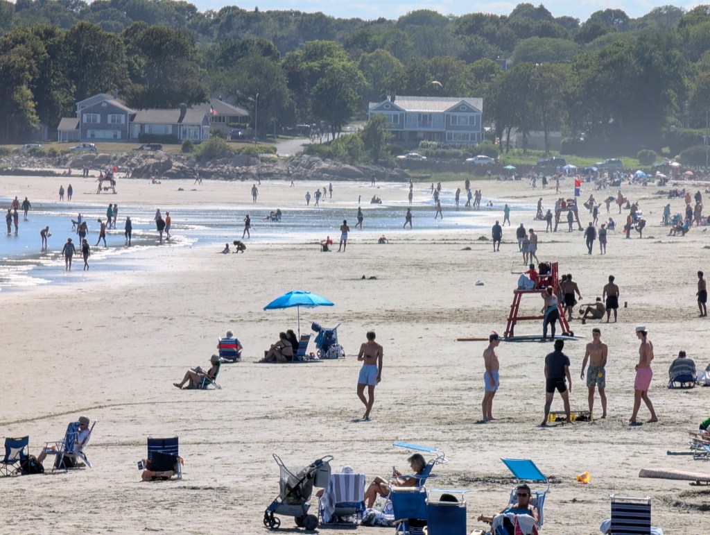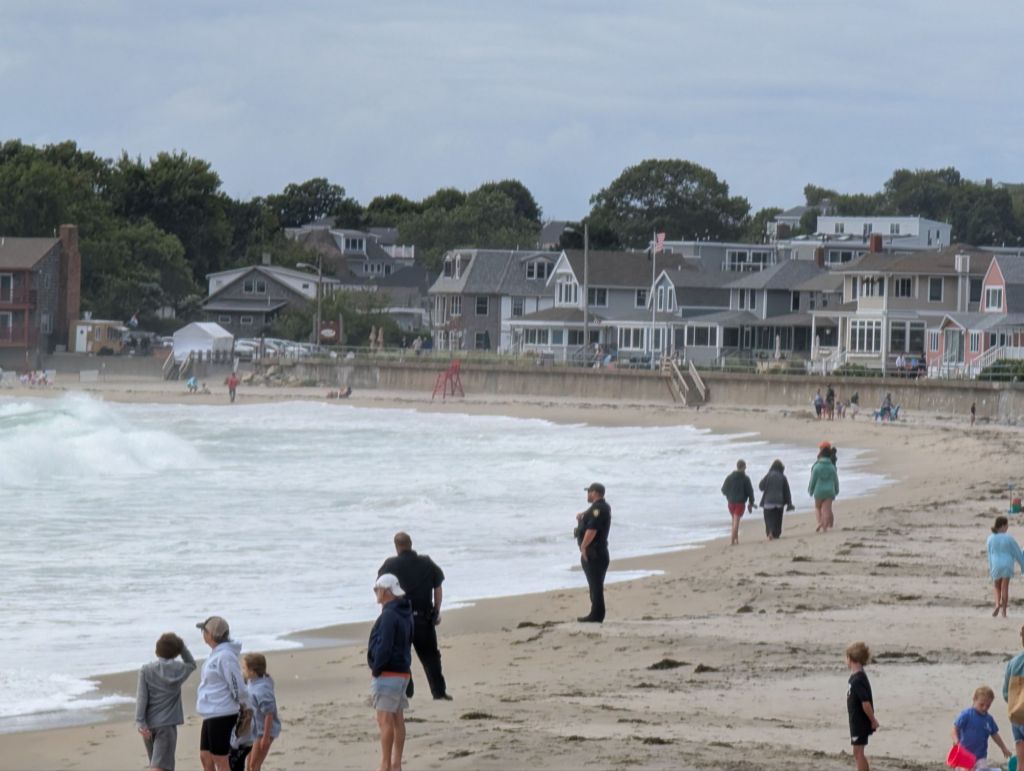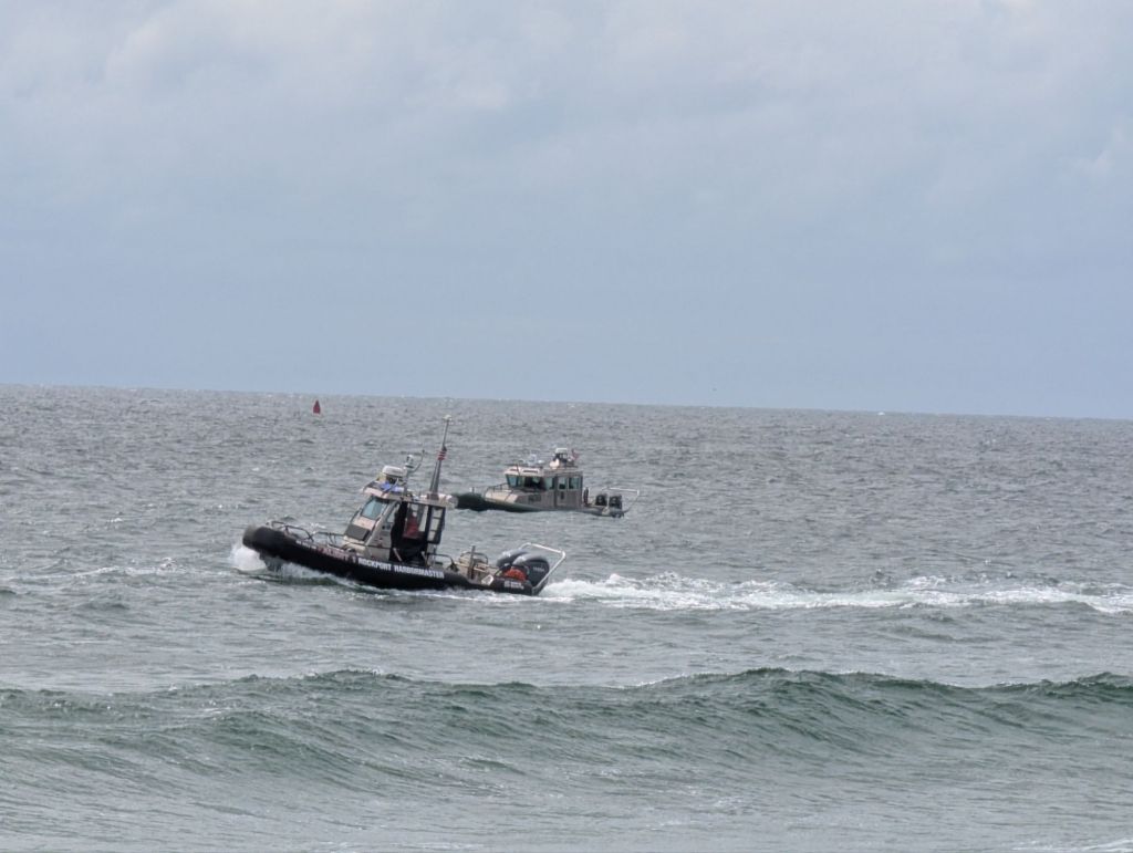Buzz on Long Beach about the shark sightings. Harbor Master boats and police patrols on sand.