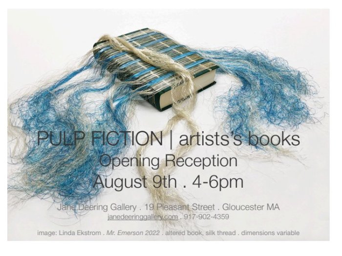 PULP FICTION | artists’ books opens at Jane Deering Gallery with a Reception on Saturday August 9th from 4-6pm. The gallery is located at 19 Pleasant Street, Gloucester. Hours: Fri & Sat 1-5pm; Sun 1-4pm and by appointment @ 917-902-4359.