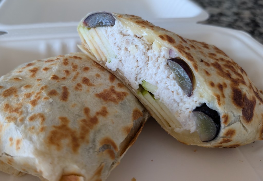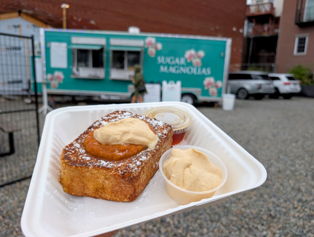 Sugar Magnolia’s toasties are scrumptious specialty sandwich options grilled “toasty” in a flour wrap ready to grab hold and go (with pickles and chips). This one is chicken salad with sliced apple and red grapes. The french toast of the day was cozy fall spice pumpkin with infused fluffy whip cream. Both are ample enough to share. Can’t choose? Bring a friend and split a sweet and salty order for two!